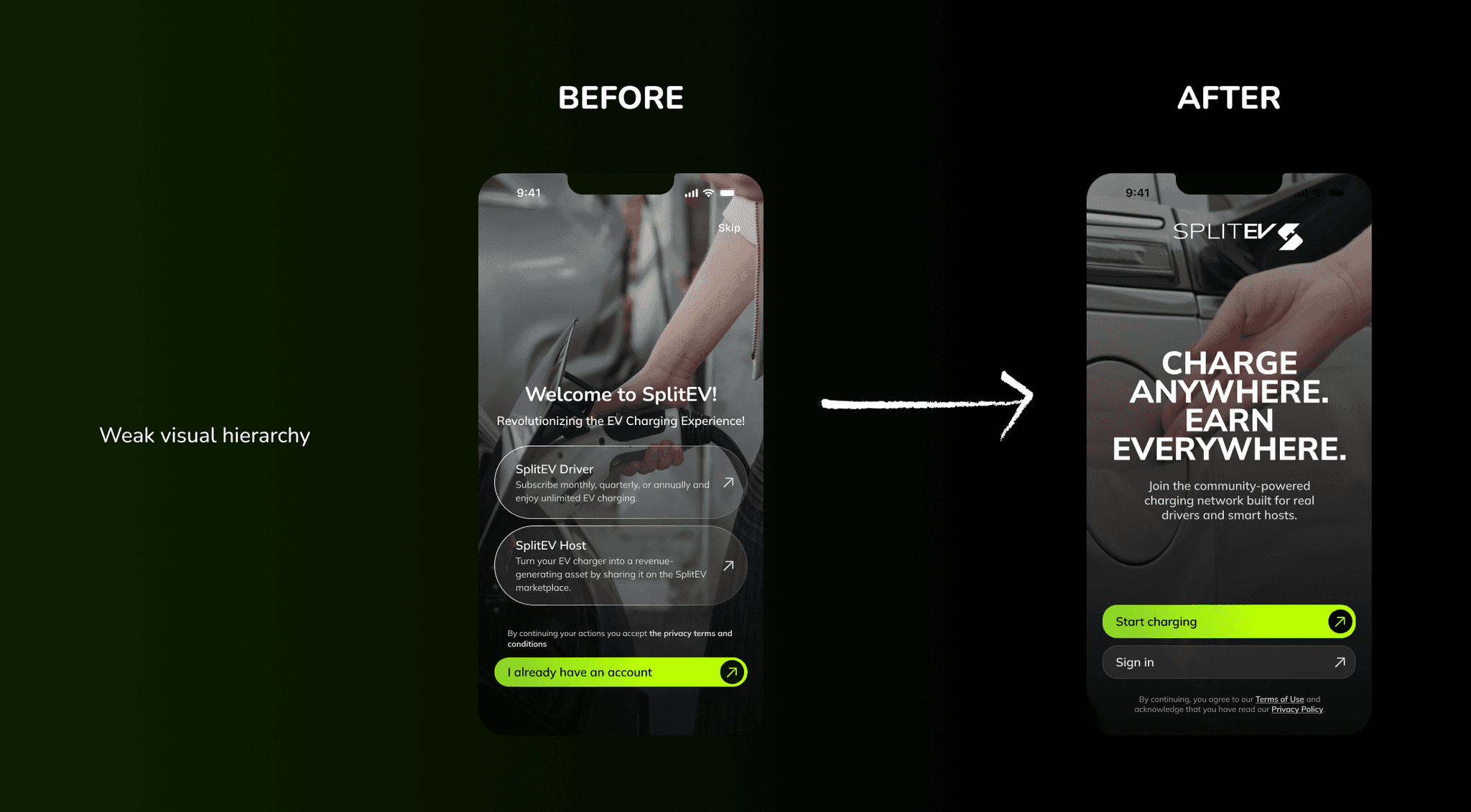 At the time of collaboration, SplitEV was a Series A startup and alum of the TechStars accelerator program that was preparing for go-live launch the next quarter. However, they lacked a full-time US-based designer and required greater design support to finish the mobile design of the MVP, web app, and website. As a result, B’More Designful joined SplitEV as a design partner.